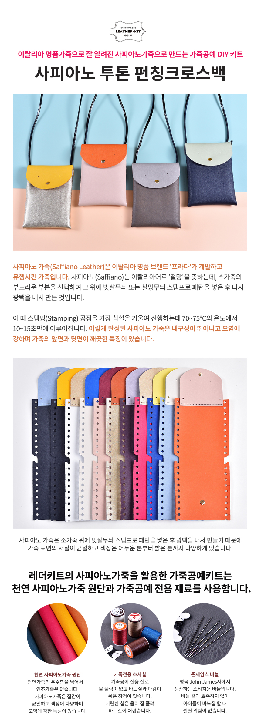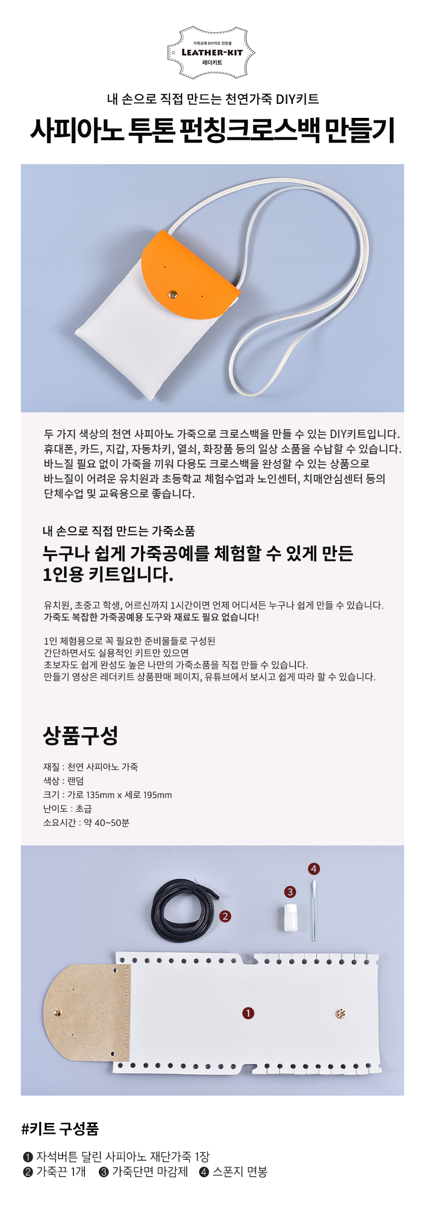 상품명[레더키트] 바느질없는 투톤 펀칭크로스백 만들기 10개(천연사피아노가죽 공예DIY키트) 색상 랜덤