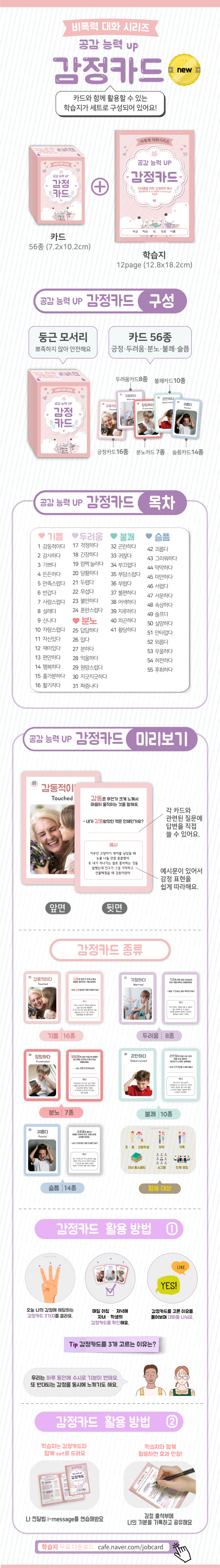 '기쁨 두려움 분노 불쾌 슬픔' 5가지 분류에 따라 55개 감정카드 & 학습지로 구성되어 있다.